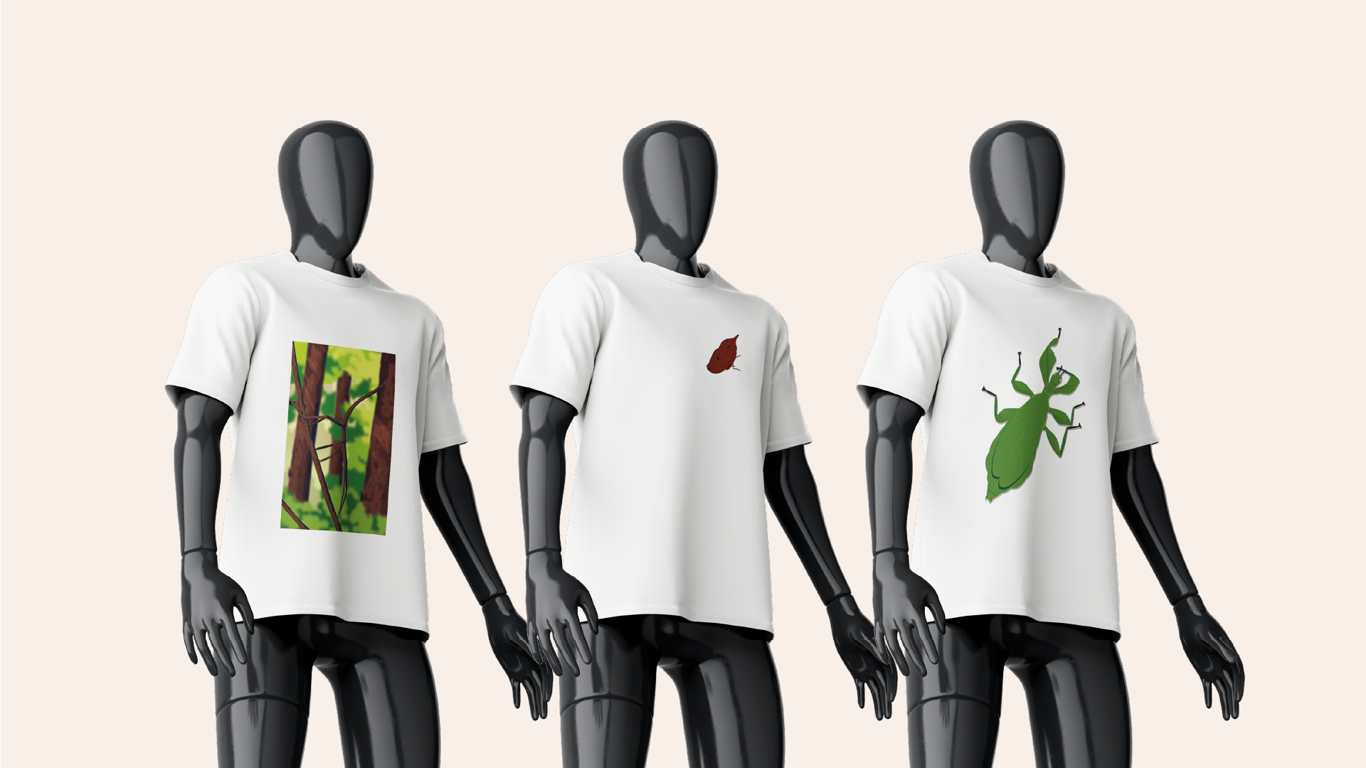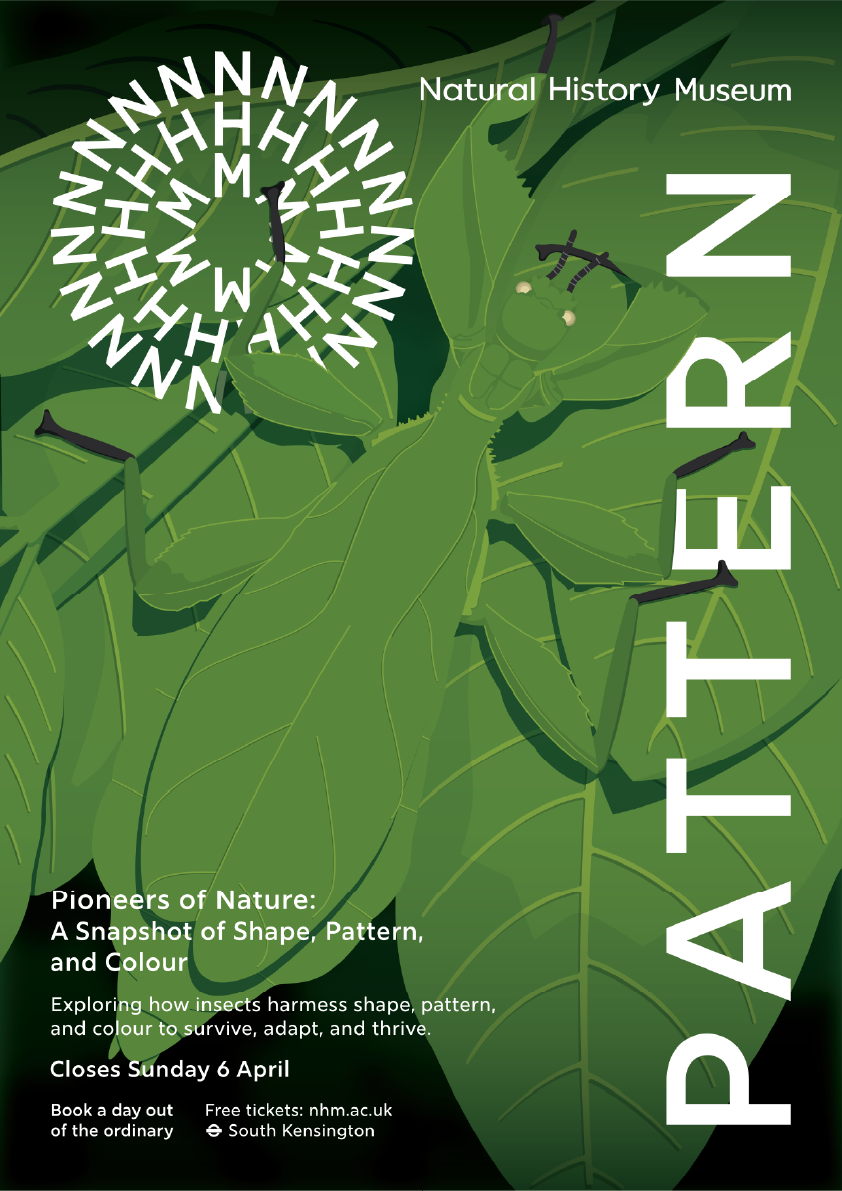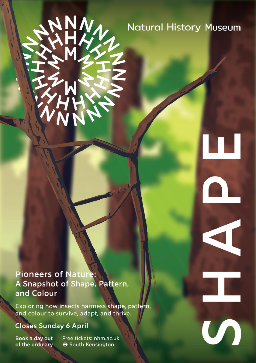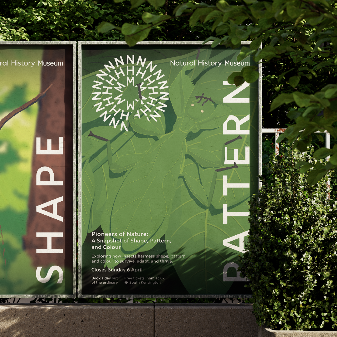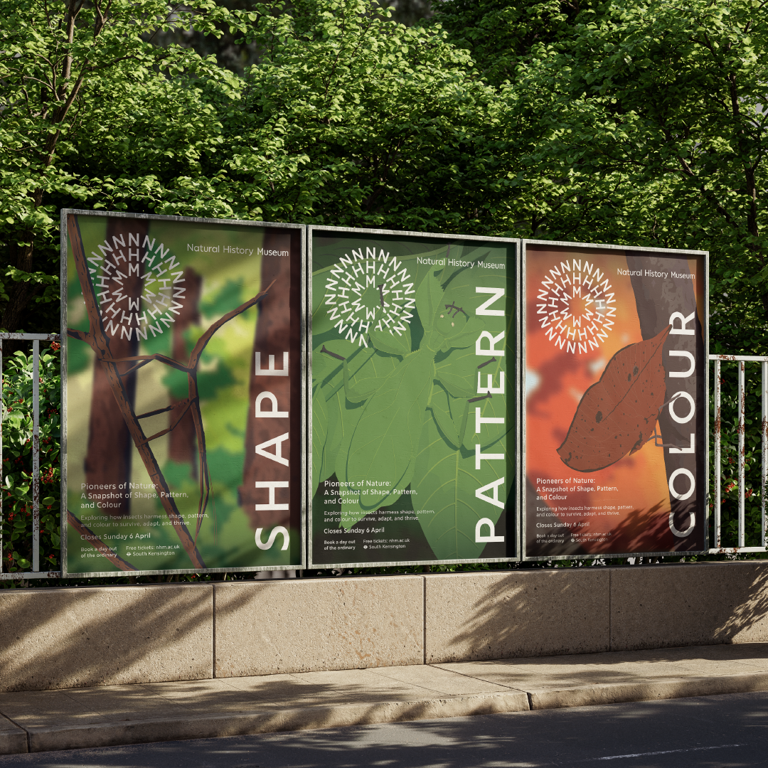 Pioneers of Nature is a college concept project created in response to a brief for the Natural History Museum’s newest exhibition. The project explores shape, pattern, and colour through three insects, the leaf bug, stick bug, and dead leaf butterfly, highlighting how their unique forms have evolved as a method of camouflage and survival. The work focuses on observing natural design systems and translating them into a cohesive visual narrative.
